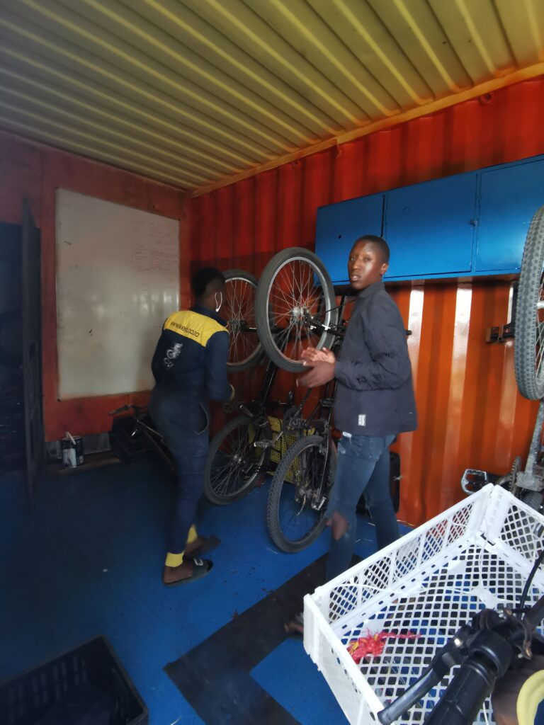 Nach der Neugestaltung des Fahrradcontainers muss auch der fünfte Container für die Werkstatt zweckmässig eingerichtet werden. Das freut natürlich auch Thabani Ngwenya, der äusserst begabte selfmade Velomechaniker, der von Anfang an bei Cloudy Deliveries dabei ist. Bis anhin hatte er im Fahrradcontainer eine kleine Ecke für sein Material und Werkzeug. Mit seinem *eigenen" Container ist er heute überglücklich. Wer weiss, was in Zukunft darin alles noch repariert wird?